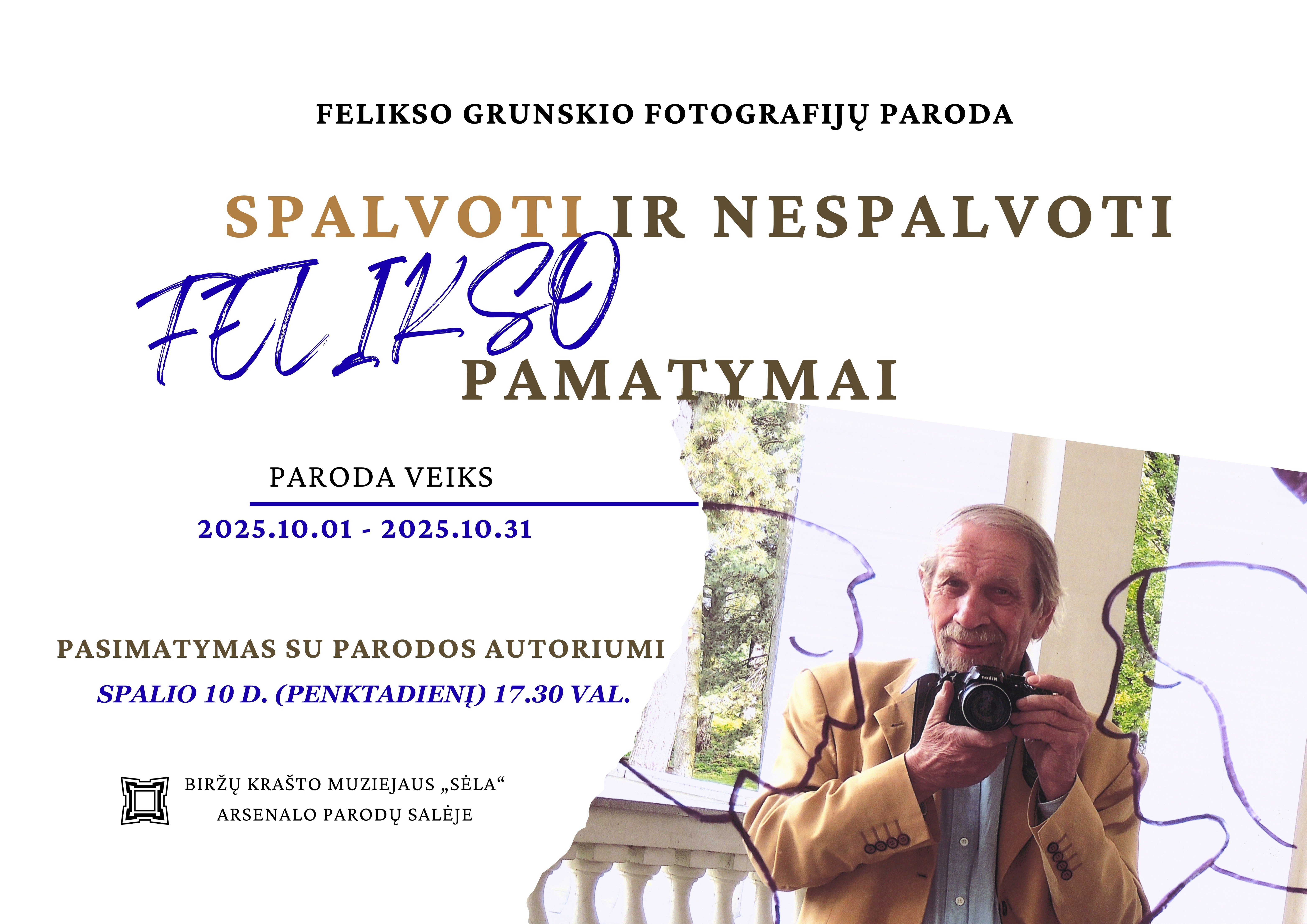 Kviečiame apsilankyti Felikso Grunskio fotografijų parodoje „Spalvoti ir nespalvoti Felikso pamatymai“, kuri iki spalio 31 d. veiks Biržų pilies arsenalo ekspozicijų salėje.